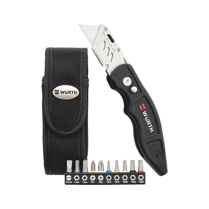 Settinu fylgir hnífur með trapisulaga blaði, 10 hágæða bitasett og nylonhulstur til að festa á belti.